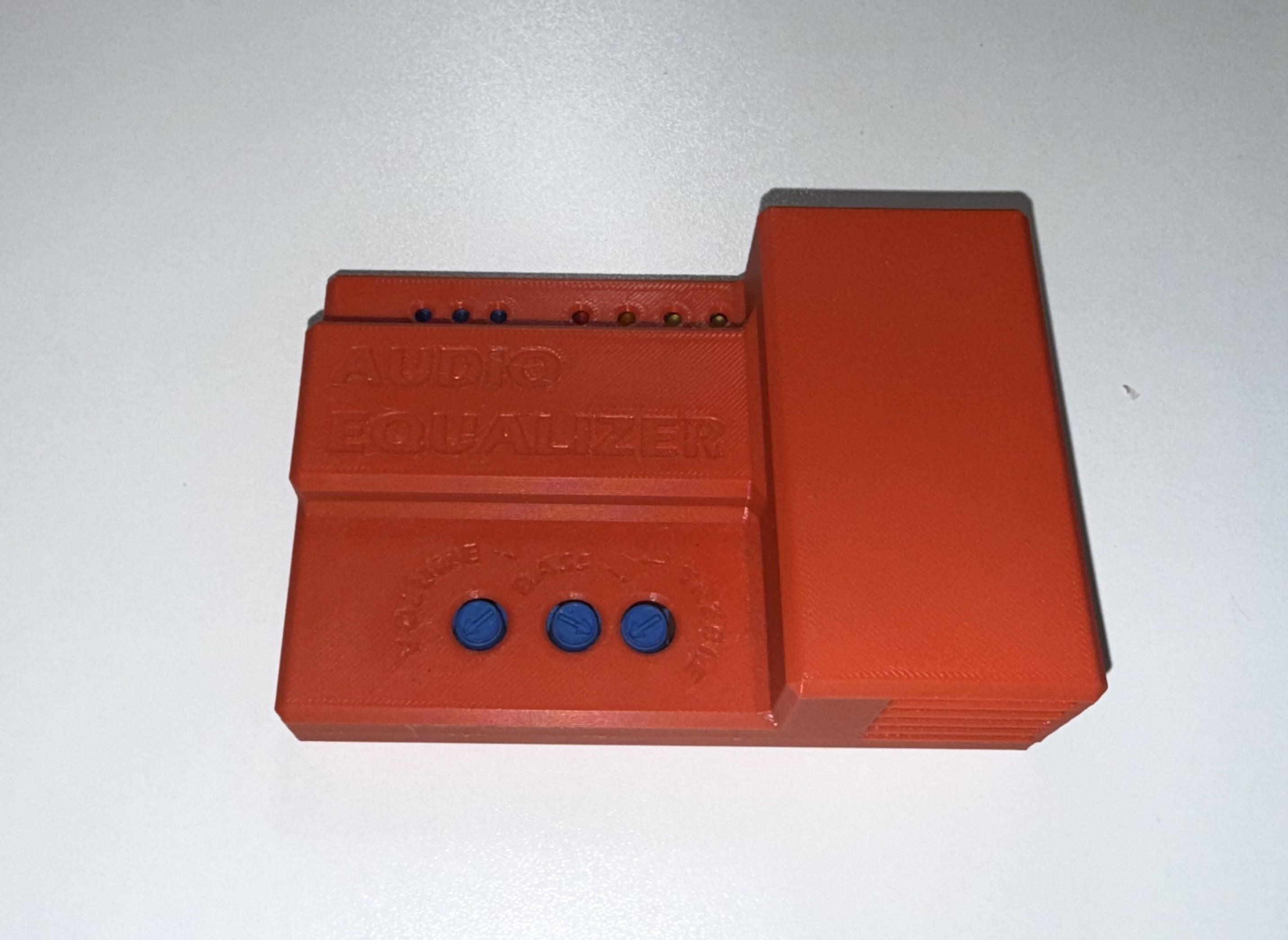 Multi-band analog equalizer with active op-amp filter stages for bass, mid, and treble control. Hand-etched custom PCB, potentiometer-driven frequency adjustment, and a 3D-printed enclosure. Built from breadboard prototype to finished product.
